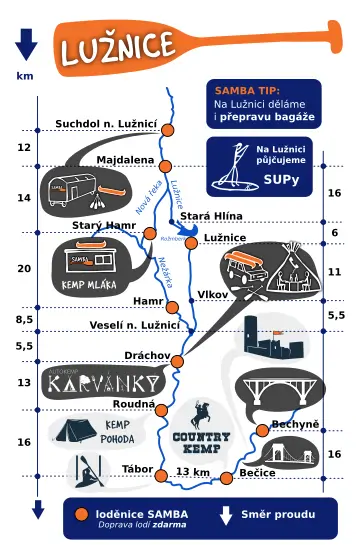 - K výpůjčce od nás dostanete mapku Lužnice s vyznačenými loděnice, kempy a jezy. Pokud byste si chtěli znalost Lužnice osvěžit před vyplutím, tady si můžete mapku stáhnout. Kdo je vyznavačem klasičtější kilometráže, může si ji stáhnout tady.